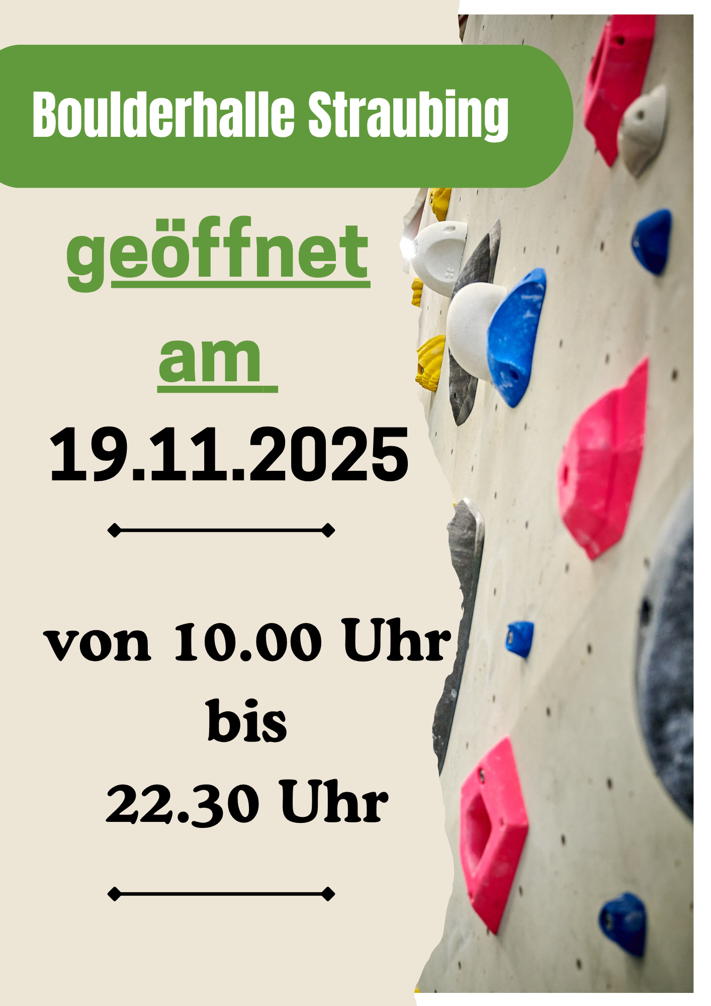 Am 18.11.25 von 17.00 Uhr bis 21.00 Uhr in der Boulderhalle in Straubing.